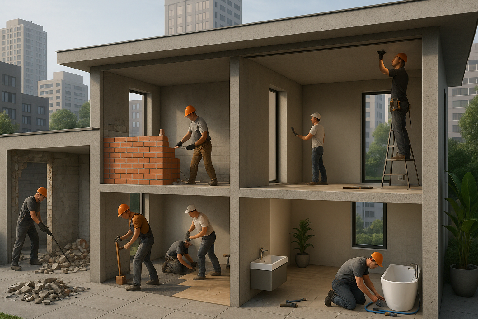 - Prace budowlane (budowa nowych ścian działowych, tynkowanie ścian, wyrównywanie podłóg).